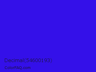 Decimal 54600193 Color is a normal indigo color and the nearest color is Bluebonnet #1c1cf0. Hex code #3410e9 and RGB value is rgb(52,16,233). In RGB color space, this color is composed of 20% red, 6% green, 91% blue, In CMYK color space, this color is composed of 78% cyan, 93% magenta, 0% yellow , 9% black , In HSL color space, this color has a hue angle of 250° , 87% saturation and 49% lightness.