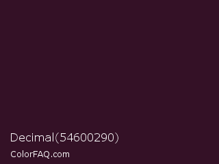 Decimal 54600290 Color is a very dark magenta color and the nearest color is Melanzane #300529. Hex code #341126 and RGB value is rgb(52,17,38). In RGB color space, this color is composed of 20% red, 7% green, 15% blue, In CMYK color space, this color is composed of 0% cyan, 67% magenta, 27% yellow , 80% black , In HSL color space, this color has a hue angle of 324° , 51% saturation and 14% lightness.