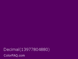 Decimal 13977804880 Color is a very dark magenta color and the nearest color is Clairvoyant #480656. Hex code #570062 and RGB value is rgb(87,0,98). In RGB color space, this color is composed of 34% red, 0% green, 38% blue, In CMYK color space, this color is composed of 11% cyan, 100% magenta, 0% yellow , 62% black , In HSL color space, this color has a hue angle of 293° , 100% saturation and 19% lightness.