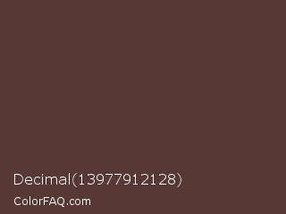 Decimal 13977912128 Color is a dark red color and the nearest color is Congo Brown #593737. Hex code #573834 and RGB value is rgb(87,56,52). In RGB color space, this color is composed of 34% red, 22% green, 20% blue, In CMYK color space, this color is composed of 0% cyan, 36% magenta, 40% yellow , 66% black , In HSL color space, this color has a hue angle of 7° , 25% saturation and 27% lightness.