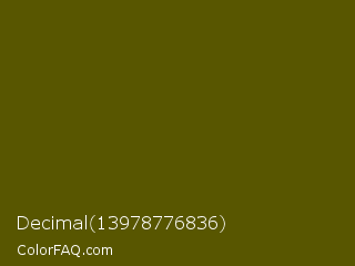 Decimal 13978776836 Color is a very dark yellow color and the nearest color is Verdun Green #495400. Hex code #585600 and RGB value is rgb(88,86,0). In RGB color space, this color is composed of 35% red, 34% green, 0% blue, In CMYK color space, this color is composed of 0% cyan, 2% magenta, 100% yellow , 65% black , In HSL color space, this color has a hue angle of 59° , 100% saturation and 17% lightness.