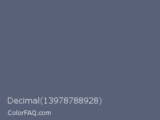 Decimal 13978788928 Color is a normal blue color and the nearest color is Comet #5c5d75. Hex code #586178 and RGB value is rgb(88,97,120). In RGB color space, this color is composed of 35% red, 38% green, 47% blue, In CMYK color space, this color is composed of 27% cyan, 19% magenta, 0% yellow , 53% black , In HSL color space, this color has a hue angle of 223° , 15% saturation and 41% lightness.