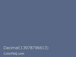 Decimal 13978796613 Color is a normal blue color and the nearest color is Paynes Grey #536878. Hex code #586885 and RGB value is rgb(88,104,133). In RGB color space, this color is composed of 35% red, 41% green, 52% blue, In CMYK color space, this color is composed of 34% cyan, 22% magenta, 0% yellow , 48% black , In HSL color space, this color has a hue angle of 219° , 20% saturation and 43% lightness.
