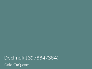 Decimal 13978847384 Color is a normal cyan color and the nearest color is Wintergreen Dream #56887d. Hex code #588282 and RGB value is rgb(88,130,130). In RGB color space, this color is composed of 35% red, 51% green, 51% blue, In CMYK color space, this color is composed of 32% cyan, 0% magenta, 0% yellow , 49% black , In HSL color space, this color has a hue angle of 180° , 19% saturation and 43% lightness.