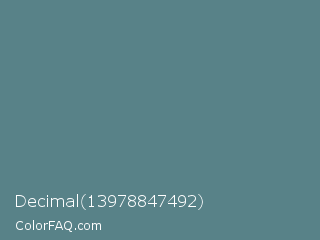 Decimal 13978847492 Color is a normal cyan color and the nearest color is Smalt Blue #51808f. Hex code #588288 and RGB value is rgb(88,130,136). In RGB color space, this color is composed of 35% red, 51% green, 53% blue, In CMYK color space, this color is composed of 35% cyan, 4% magenta, 0% yellow , 47% black , In HSL color space, this color has a hue angle of 188° , 21% saturation and 44% lightness.