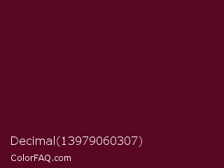 Decimal 13979060307 Color is a very dark rose color and the nearest color is Bordeaux #5c0120. Hex code #590725 and RGB value is rgb(89,7,37). In RGB color space, this color is composed of 35% red, 3% green, 15% blue, In CMYK color space, this color is composed of 0% cyan, 92% magenta, 58% yellow , 65% black , In HSL color space, this color has a hue angle of 338° , 85% saturation and 19% lightness.