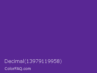 Decimal 13979119958 Color is a normal violet color and the nearest color is Daisy Bush #4f2398. Hex code #592794 and RGB value is rgb(89,39,148). In RGB color space, this color is composed of 35% red, 15% green, 58% blue, In CMYK color space, this color is composed of 40% cyan, 74% magenta, 0% yellow , 42% black , In HSL color space, this color has a hue angle of 268° , 58% saturation and 37% lightness.