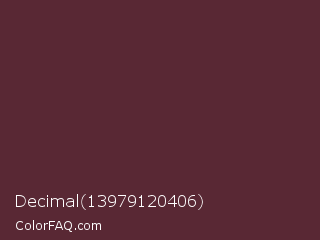 Decimal 13979120406 Color is a dark red color and the nearest color is Wine Berry #591d35. Hex code #592834 and RGB value is rgb(89,40,52). In RGB color space, this color is composed of 35% red, 16% green, 20% blue, In CMYK color space, this color is composed of 0% cyan, 55% magenta, 42% yellow , 65% black , In HSL color space, this color has a hue angle of 345° , 38% saturation and 25% lightness.