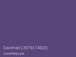 Decimal 13979174920 Color is a normal violet color and the nearest color is Cyber Grape #58427c. Hex code #594578 and RGB value is rgb(89,69,120). In RGB color space, this color is composed of 35% red, 27% green, 47% blue, In CMYK color space, this color is composed of 26% cyan, 43% magenta, 0% yellow , 53% black , In HSL color space, this color has a hue angle of 264° , 27% saturation and 37% lightness.