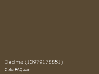 Decimal 13979178851 Color is a dark orange color and the nearest color is Millbrook #594433. Hex code #594933 and RGB value is rgb(89,73,51). In RGB color space, this color is composed of 35% red, 29% green, 20% blue, In CMYK color space, this color is composed of 0% cyan, 18% magenta, 43% yellow , 65% black , In HSL color space, this color has a hue angle of 35° , 27% saturation and 27% lightness.