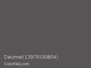 Decimal 13979190804 Color is a normal rose color and the nearest color is Davys Grey #555555. Hex code #595456 and RGB value is rgb(89,84,86). In RGB color space, this color is composed of 35% red, 33% green, 34% blue, In CMYK color space, this color is composed of 0% cyan, 6% magenta, 3% yellow , 65% black , In HSL color space, this color has a hue angle of 336° , 3% saturation and 34% lightness.