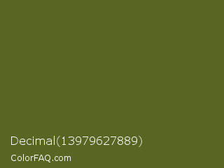 Decimal 13979627889 Color is a dark lime color and the nearest color is Dark Olive Green #556b2f. Hex code #596623 and RGB value is rgb(89,102,35). In RGB color space, this color is composed of 35% red, 40% green, 14% blue, In CMYK color space, this color is composed of 13% cyan, 0% magenta, 66% yellow , 60% black , In HSL color space, this color has a hue angle of 72° , 49% saturation and 27% lightness.