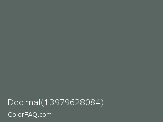 Decimal 13979628084 Color is a normal green color and the nearest color is Storm Dust #646463. Hex code #596662 and RGB value is rgb(89,102,98). In RGB color space, this color is composed of 35% red, 40% green, 38% blue, In CMYK color space, this color is composed of 13% cyan, 0% magenta, 4% yellow , 60% black , In HSL color space, this color has a hue angle of 162° , 7% saturation and 37% lightness.