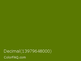 Decimal 13979648000 Color is a dark lime color and the nearest color is Avocado #568203. Hex code #597900 and RGB value is rgb(89,121,0). In RGB color space, this color is composed of 35% red, 47% green, 0% blue, In CMYK color space, this color is composed of 26% cyan, 0% magenta, 100% yellow , 53% black , In HSL color space, this color has a hue angle of 76° , 100% saturation and 24% lightness.
