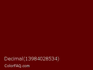 Decimal 13984028534 Color is a very dark red color and the nearest color is Rosewood #65000b. Hex code #600000 and RGB value is rgb(96,0,0). In RGB color space, this color is composed of 38% red, 0% green, 0% blue, In CMYK color space, this color is composed of 0% cyan, 100% magenta, 100% yellow , 62% black , In HSL color space, this color has a hue angle of 0° , 100% saturation and 19% lightness.