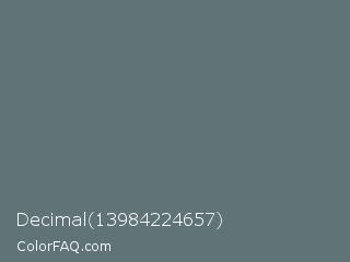 Decimal 13984224657 Color is a normal cyan color and the nearest color is Nevada #646e75. Hex code #607477 and RGB value is rgb(96,116,119). In RGB color space, this color is composed of 38% red, 45% green, 47% blue, In CMYK color space, this color is composed of 19% cyan, 3% magenta, 0% yellow , 53% black , In HSL color space, this color has a hue angle of 188° , 11% saturation and 42% lightness.