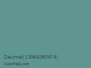 Decimal 13984285474 Color is a normal cyan color and the nearest color is Patina #639a8f. Hex code #609692 and RGB value is rgb(96,150,146). In RGB color space, this color is composed of 38% red, 59% green, 57% blue, In CMYK color space, this color is composed of 36% cyan, 0% magenta, 3% yellow , 41% black , In HSL color space, this color has a hue angle of 176° , 22% saturation and 48% lightness.