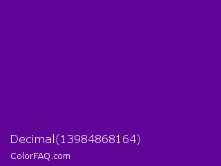 Decimal 13984868164 Color is a normal purple color and the nearest color is Purple #660099. Hex code #610598 and RGB value is rgb(97,5,152). In RGB color space, this color is composed of 38% red, 2% green, 60% blue, In CMYK color space, this color is composed of 36% cyan, 97% magenta, 0% yellow , 40% black , In HSL color space, this color has a hue angle of 278° , 94% saturation and 31% lightness.