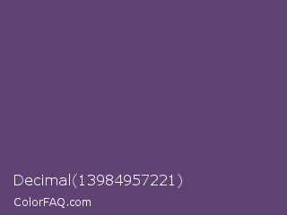 Decimal 13984957221 Color is a normal purple color and the nearest color is Cyber Grape #58427c. Hex code #614275 and RGB value is rgb(97,66,117). In RGB color space, this color is composed of 38% red, 26% green, 46% blue, In CMYK color space, this color is composed of 17% cyan, 44% magenta, 0% yellow , 54% black , In HSL color space, this color has a hue angle of 276° , 28% saturation and 36% lightness.