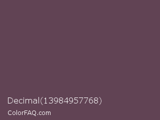 Decimal 13984957768 Color is a normal magenta color and the nearest color is Eggplant #614051. Hex code #614354 and RGB value is rgb(97,67,84). In RGB color space, this color is composed of 38% red, 26% green, 33% blue, In CMYK color space, this color is composed of 0% cyan, 31% magenta, 13% yellow , 62% black , In HSL color space, this color has a hue angle of 326° , 18% saturation and 32% lightness.