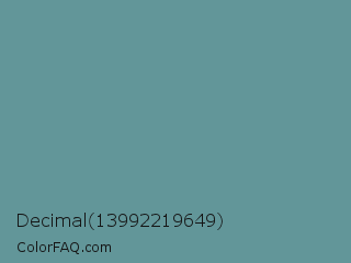 Decimal 13992219649 Color is a normal cyan color and the nearest color is Desaturated Cyan #669999. Hex code #629699 and RGB value is rgb(98,150,153). In RGB color space, this color is composed of 38% red, 59% green, 60% blue, In CMYK color space, this color is composed of 36% cyan, 2% magenta, 0% yellow , 40% black , In HSL color space, this color has a hue angle of 183° , 22% saturation and 49% lightness.