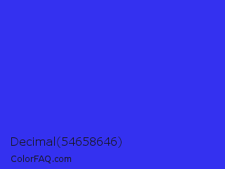 Decimal 54658646 Color is a normal indigo color and the nearest color is Palatinate Blue #273be2. Hex code #3431f0 and RGB value is rgb(52,49,240). In RGB color space, this color is composed of 20% red, 19% green, 94% blue, In CMYK color space, this color is composed of 78% cyan, 80% magenta, 0% yellow , 6% black , In HSL color space, this color has a hue angle of 241° , 86% saturation and 57% lightness.
