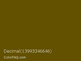 Decimal 13993346646 Color is a very dark yellow color and the nearest color is Antique Bronze #704a07. Hex code #645100 and RGB value is rgb(100,81,0). In RGB color space, this color is composed of 39% red, 32% green, 0% blue, In CMYK color space, this color is composed of 0% cyan, 19% magenta, 100% yellow , 61% black , In HSL color space, this color has a hue angle of 49° , 100% saturation and 20% lightness.