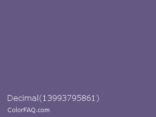 Decimal 13993795861 Color is a normal indigo color and the nearest color is Dolphin #646077. Hex code #655883 and RGB value is rgb(101,88,131). In RGB color space, this color is composed of 40% red, 35% green, 51% blue, In CMYK color space, this color is composed of 23% cyan, 33% magenta, 0% yellow , 49% black , In HSL color space, this color has a hue angle of 258° , 20% saturation and 43% lightness.
