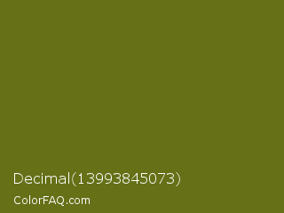 Decimal 13993845073 Color is a dark yellow color and the nearest color is Fern Frond #657220. Hex code #657017 and RGB value is rgb(101,112,23). In RGB color space, this color is composed of 40% red, 44% green, 9% blue, In CMYK color space, this color is composed of 10% cyan, 0% magenta, 79% yellow , 56% black , In HSL color space, this color has a hue angle of 67° , 66% saturation and 26% lightness.