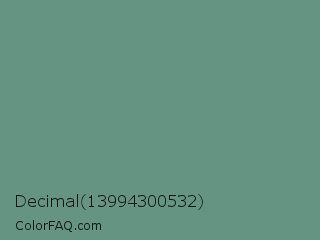 Decimal 13994300532 Color is a normal green color and the nearest color is Patina #639a8f. Hex code #659482 and RGB value is rgb(101,148,130). In RGB color space, this color is composed of 40% red, 58% green, 51% blue, In CMYK color space, this color is composed of 32% cyan, 0% magenta, 12% yellow , 42% black , In HSL color space, this color has a hue angle of 157° , 19% saturation and 49% lightness.