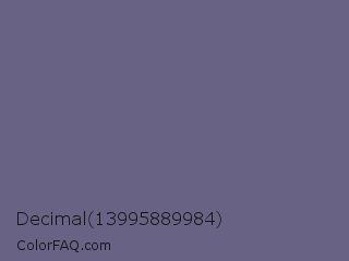 Decimal 13995889984 Color is a normal indigo color and the nearest color is Dolphin #646077. Hex code #686384 and RGB value is rgb(104,99,132). In RGB color space, this color is composed of 41% red, 39% green, 52% blue, In CMYK color space, this color is composed of 21% cyan, 25% magenta, 0% yellow , 48% black , In HSL color space, this color has a hue angle of 249° , 14% saturation and 45% lightness.