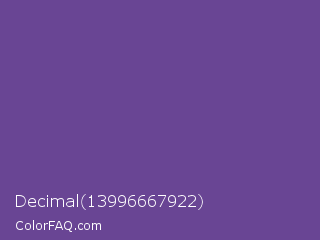 Decimal 13996667922 Color is a normal violet color and the nearest color is Affair #714693. Hex code #694594 and RGB value is rgb(105,69,148). In RGB color space, this color is composed of 41% red, 27% green, 58% blue, In CMYK color space, this color is composed of 29% cyan, 53% magenta, 0% yellow , 42% black , In HSL color space, this color has a hue angle of 267° , 36% saturation and 43% lightness.