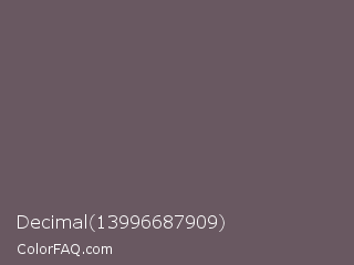 Decimal 13996687909 Color is a normal rose color and the nearest color is Scorpion #695f62. Hex code #695861 and RGB value is rgb(105,88,97). In RGB color space, this color is composed of 41% red, 35% green, 38% blue, In CMYK color space, this color is composed of 0% cyan, 16% magenta, 8% yellow , 59% black , In HSL color space, this color has a hue angle of 328° , 9% saturation and 38% lightness.