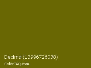 Decimal 13996726038 Color is a very dark yellow color and the nearest color is Spicy Mustard #74640d. Hex code #696604 and RGB value is rgb(105,102,4). In RGB color space, this color is composed of 41% red, 40% green, 2% blue, In CMYK color space, this color is composed of 0% cyan, 3% magenta, 96% yellow , 59% black , In HSL color space, this color has a hue angle of 58° , 93% saturation and 21% lightness.