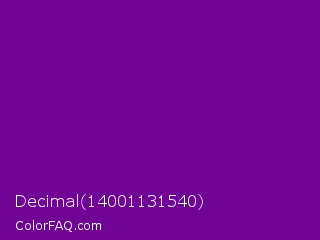 Decimal 14001131540 Color is a dark purple color and the nearest color is Purple #660099. Hex code #700296 and RGB value is rgb(112,2,150). In RGB color space, this color is composed of 44% red, 1% green, 59% blue, In CMYK color space, this color is composed of 25% cyan, 99% magenta, 0% yellow , 41% black , In HSL color space, this color has a hue angle of 285° , 97% saturation and 30% lightness.