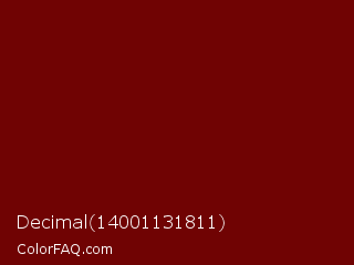 Decimal 14001131811 Color is a dark red color and the nearest color is Lonestar #6d0101. Hex code #700303 and RGB value is rgb(112,3,3). In RGB color space, this color is composed of 44% red, 1% green, 1% blue, In CMYK color space, this color is composed of 0% cyan, 97% magenta, 97% yellow , 56% black , In HSL color space, this color has a hue angle of 0° , 95% saturation and 23% lightness.