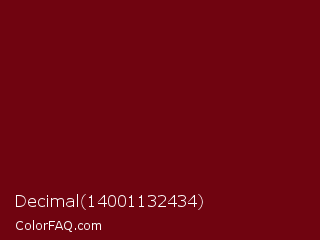 Decimal 14001132434 Color is a dark red color and the nearest color is Venetian Red #72010f. Hex code #700410 and RGB value is rgb(112,4,16). In RGB color space, this color is composed of 44% red, 2% green, 6% blue, In CMYK color space, this color is composed of 0% cyan, 96% magenta, 86% yellow , 56% black , In HSL color space, this color has a hue angle of 353° , 93% saturation and 23% lightness.