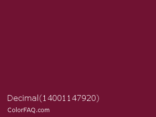 Decimal 14001147920 Color is a dark rose color and the nearest color is Claret #7f1734. Hex code #701232 and RGB value is rgb(112,18,50). In RGB color space, this color is composed of 44% red, 7% green, 20% blue, In CMYK color space, this color is composed of 0% cyan, 84% magenta, 55% yellow , 56% black , In HSL color space, this color has a hue angle of 340° , 72% saturation and 25% lightness.