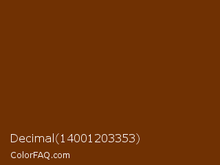 Decimal 14001203353 Color is a dark orange color and the nearest color is Nutmeg Wood Finish #683600. Hex code #703103 and RGB value is rgb(112,49,3). In RGB color space, this color is composed of 44% red, 19% green, 1% blue, In CMYK color space, this color is composed of 0% cyan, 56% magenta, 97% yellow , 56% black , In HSL color space, this color has a hue angle of 25° , 95% saturation and 23% lightness.