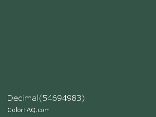 Decimal 54694983 Color is a dark green color and the nearest color is Dark Slate Gray #2f4f4f. Hex code #345447 and RGB value is rgb(52,84,71). In RGB color space, this color is composed of 20% red, 33% green, 28% blue, In CMYK color space, this color is composed of 38% cyan, 0% magenta, 15% yellow , 67% black , In HSL color space, this color has a hue angle of 156° , 24% saturation and 27% lightness.