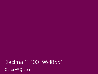 Decimal 14001964855 Color is a dark magenta color and the nearest color is Pompadour #660045. Hex code #710351 and RGB value is rgb(113,3,81). In RGB color space, this color is composed of 44% red, 1% green, 32% blue, In CMYK color space, this color is composed of 0% cyan, 97% magenta, 28% yellow , 56% black , In HSL color space, this color has a hue angle of 317° , 95% saturation and 23% lightness.
