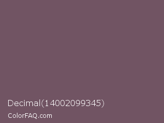 Decimal 14002099345 Color is a normal rose color and the nearest color is Scorpion #695f62. Hex code #715463 and RGB value is rgb(113,84,99). In RGB color space, this color is composed of 44% red, 33% green, 39% blue, In CMYK color space, this color is composed of 0% cyan, 26% magenta, 12% yellow , 56% black , In HSL color space, this color has a hue angle of 329° , 15% saturation and 39% lightness.
