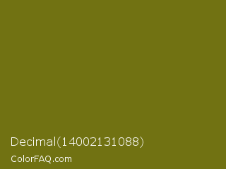 Decimal 14002131088 Color is a dark yellow color and the nearest color is Olivetone #716e10. Hex code #717212 and RGB value is rgb(113,114,18). In RGB color space, this color is composed of 44% red, 45% green, 7% blue, In CMYK color space, this color is composed of 1% cyan, 0% magenta, 84% yellow , 55% black , In HSL color space, this color has a hue angle of 61° , 73% saturation and 26% lightness.