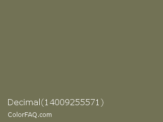 Decimal 14009255571 Color is a normal yellow color and the nearest color is Crocodile #736d58. Hex code #727255 and RGB value is rgb(114,114,85). In RGB color space, this color is composed of 45% red, 45% green, 33% blue, In CMYK color space, this color is composed of 0% cyan, 0% magenta, 25% yellow , 55% black , In HSL color space, this color has a hue angle of 60° , 15% saturation and 39% lightness.