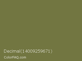 Decimal 14009259671 Color is a normal yellow color and the nearest color is Go Ben #726d4e. Hex code #727641 and RGB value is rgb(114,118,65). In RGB color space, this color is composed of 45% red, 46% green, 25% blue, In CMYK color space, this color is composed of 3% cyan, 0% magenta, 45% yellow , 54% black , In HSL color space, this color has a hue angle of 65° , 29% saturation and 36% lightness.