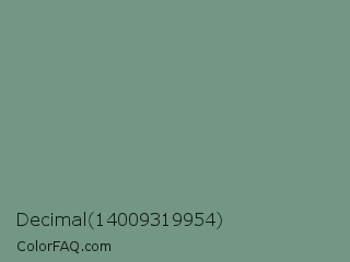 Decimal 14009319954 Color is a normal green color and the nearest color is Oxley #779e86. Hex code #729784 and RGB value is rgb(114,151,132). In RGB color space, this color is composed of 45% red, 59% green, 52% blue, In CMYK color space, this color is composed of 25% cyan, 0% magenta, 13% yellow , 41% black , In HSL color space, this color has a hue angle of 149° , 15% saturation and 52% lightness.