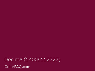 Decimal 14009512727 Color is a dark rose color and the nearest color is Siren #7a013a. Hex code #730935 and RGB value is rgb(115,9,53). In RGB color space, this color is composed of 45% red, 4% green, 21% blue, In CMYK color space, this color is composed of 0% cyan, 92% magenta, 54% yellow , 55% black , In HSL color space, this color has a hue angle of 335° , 85% saturation and 24% lightness.