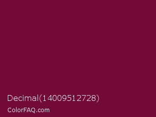 Decimal 14009512728 Color is a dark rose color and the nearest color is Siren #7a013a. Hex code #730936 and RGB value is rgb(115,9,54). In RGB color space, this color is composed of 45% red, 4% green, 21% blue, In CMYK color space, this color is composed of 0% cyan, 92% magenta, 53% yellow , 55% black , In HSL color space, this color has a hue angle of 335° , 85% saturation and 24% lightness.