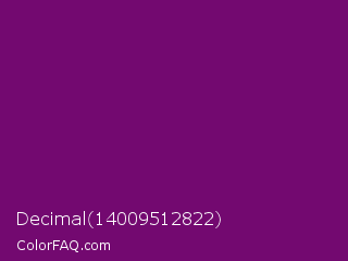 Decimal 14009512822 Color is a dark magenta color and the nearest color is Patriarch #800080. Hex code #730970 and RGB value is rgb(115,9,112). In RGB color space, this color is composed of 45% red, 4% green, 44% blue, In CMYK color space, this color is composed of 0% cyan, 92% magenta, 3% yellow , 55% black , In HSL color space, this color has a hue angle of 302° , 85% saturation and 24% lightness.
