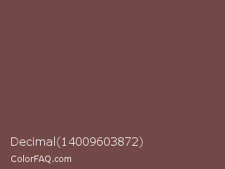 Decimal 14009603872 Color is a normal red color and the nearest color is Tuscan Red #7c4848. Hex code #734948 and RGB value is rgb(115,73,72). In RGB color space, this color is composed of 45% red, 29% green, 28% blue, In CMYK color space, this color is composed of 0% cyan, 37% magenta, 37% yellow , 55% black , In HSL color space, this color has a hue angle of 1° , 23% saturation and 37% lightness.